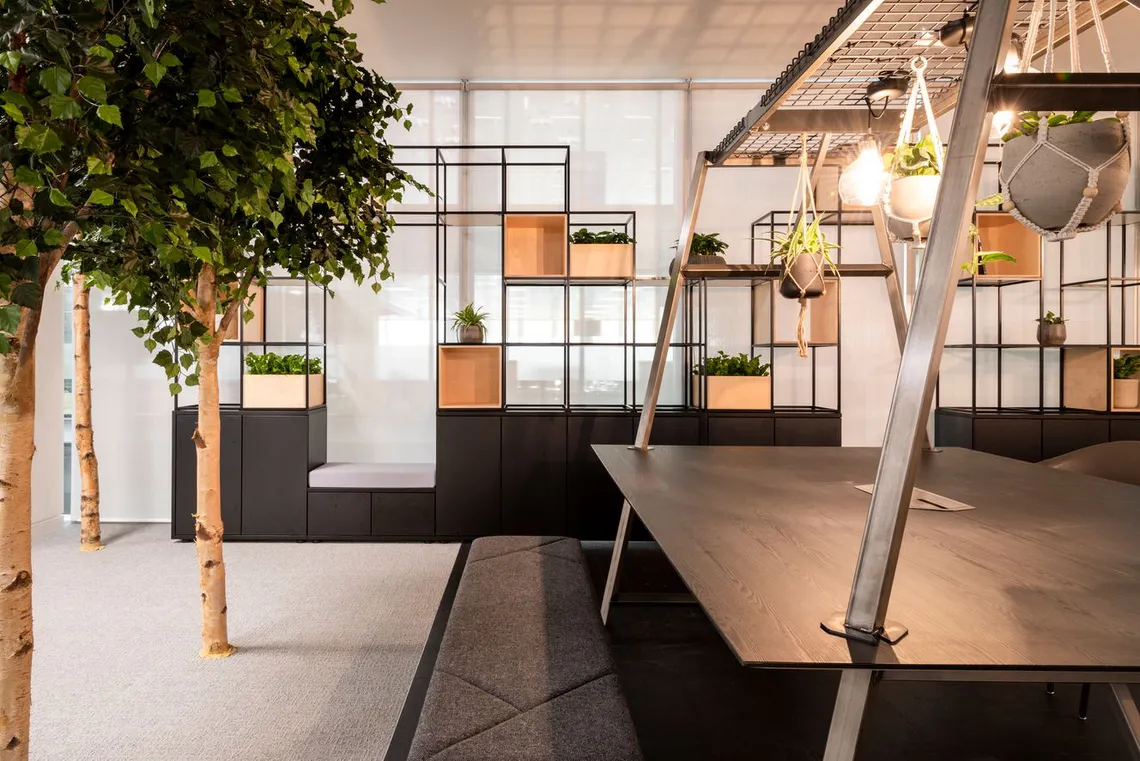 Designed to create a feeling of 'architecture within architecture', a different, 2D style Palisades construction is used elsewhere in the breakout area to essentially create a separate room within the open plan space. With the addition of large acoustic panels, MFC accessories and planting shelves, it provides visual and acoustic privacy to the collaboration area at the centre of the configuration.