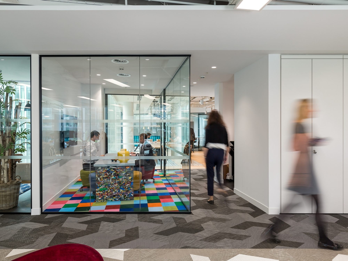 The results are wonderfully artistic and colourful: a giant floor-to-ceiling Keith Haring print across a curved wall, a waiting room made completely out of glass, a see-through desk filled with Lego pieces, even a meeting room in the style of a Victoria Line carriage. We installed our Storagewall system, providing Tishman Speyer with lot of discreet storage while leaving plenty of space for all the art.