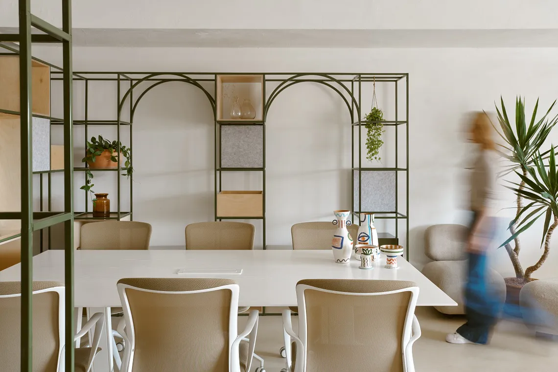 Throughout the office, a meticulous attention to detail and finishes set the tone for the architectural features of the gallery space to shine in uniqueness. Rays of natural light flood the area with a certain softness, positioning a range of shades and shapes and turning the rooms into a kind of broken white, almost golden canvas. Pulling from the conceptual ‘attic’, elements like arched iron windows painted white, link back to the iron partitions on the first floor, and to the ancient steel beams that were discovered in the ceiling. The white walls are 'upholstered' with fine willow plaster, and the concrete ceiling is also painted off-white with the addition of wooden beams. The design of the space creates an interplay between soothing color palettes, and the modularity and natural materials that are focal points in the hybrid workspaces of today’s transitional office dynamic.