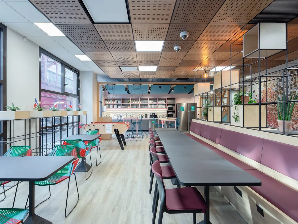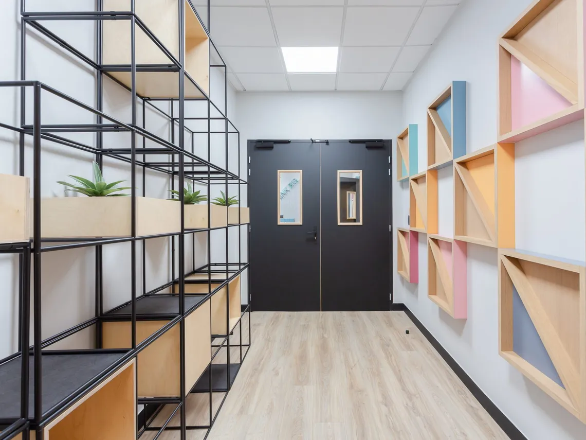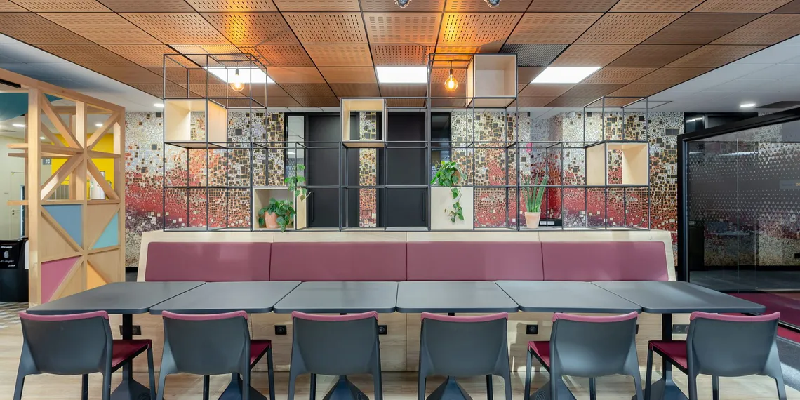 Their regional French office in Saint-Ouen, a Parisian suburb world-famous for its sprawling flea market, is wonderful and full of cutting-edge contemporary design details, from wooden ceiling tiles to colourful woven chairs to modernist wireframe chandeliers. So, in keeping with this stylish aesthetic, we supplied them with a run of Railway Carriage meeting pods in deep turquoise and our Palisades Grid system; here used as a zone divider, but also as a planter for some succulents and climbers, adding some nourishing greenery to the social space at the office’s heart.