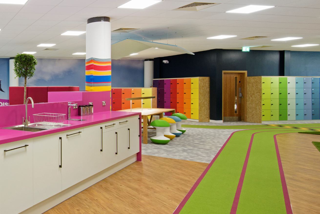 A neutral and homely design with splashes of bold colour choices and full-wall graphics give this space an individual identity and a vibrant feel
